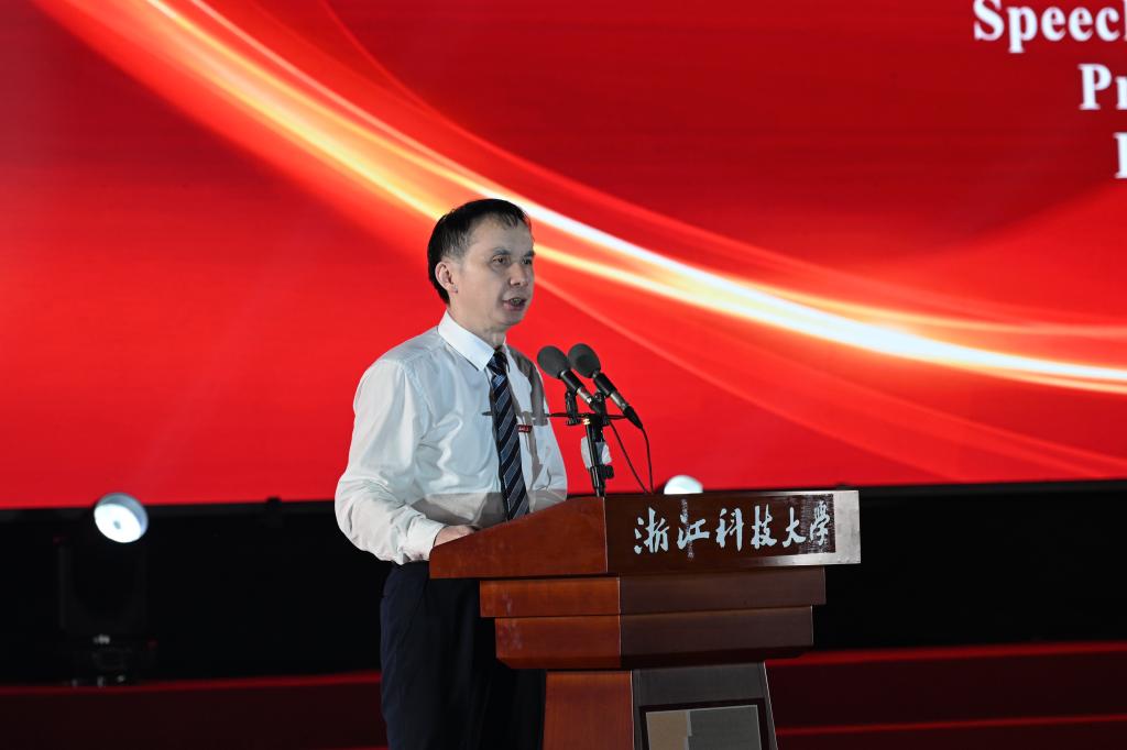 电气学院齐帅代表研究生新生发言,他讲述了自己从本科到硕士一路在浙科大的成长感悟,表达了未来将在实验室里攻坚克难,在产业一线践行使命的坚定信念。