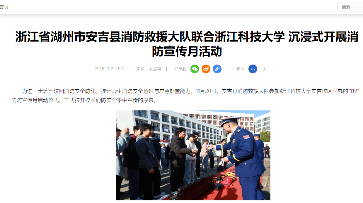 中国网:浙江省湖州市安吉县消防救援大队联合浙江科技大学 沉浸式开展消防宣传月活动