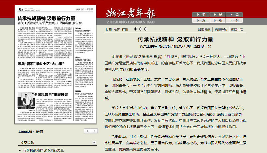 9月18日,浙江科技大学安吉校区内,一场题为“中国共产党是全民族抗战的中流砥柱”的宣讲拉开省关心下一代报告团纪念中国人民抗日战争胜利80周年巡回报告会序幕。