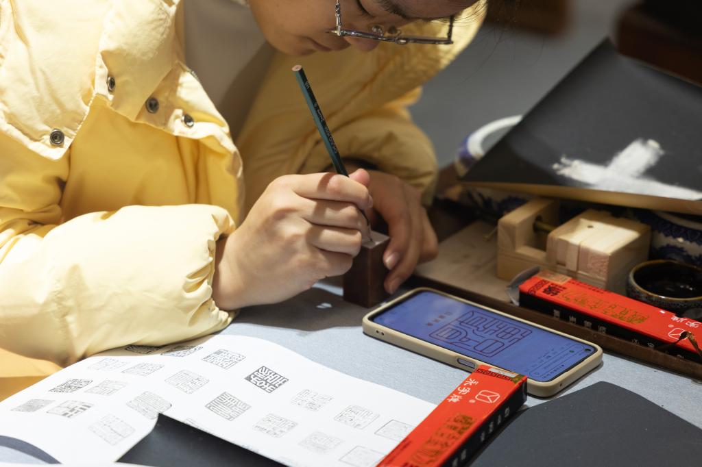 活动特邀书法家练友良老师现场指导。老师简要讲解书法演变与笔法要领后,同学们进行自由创作,在笔墨中体验静心书写之趣。篆刻环节中,同学们在书画社成员的指导下,学习篆刻历史并亲手实践。从设计印稿到执刀刻石,大家专注投入,最终完成各具特色的个人印章。“活动让我在快节奏学习中静下心来,非常充实。”一位参与者分享道。活动为学生提供了沉浸式体验传统文化的机会。