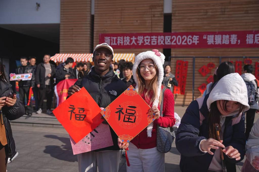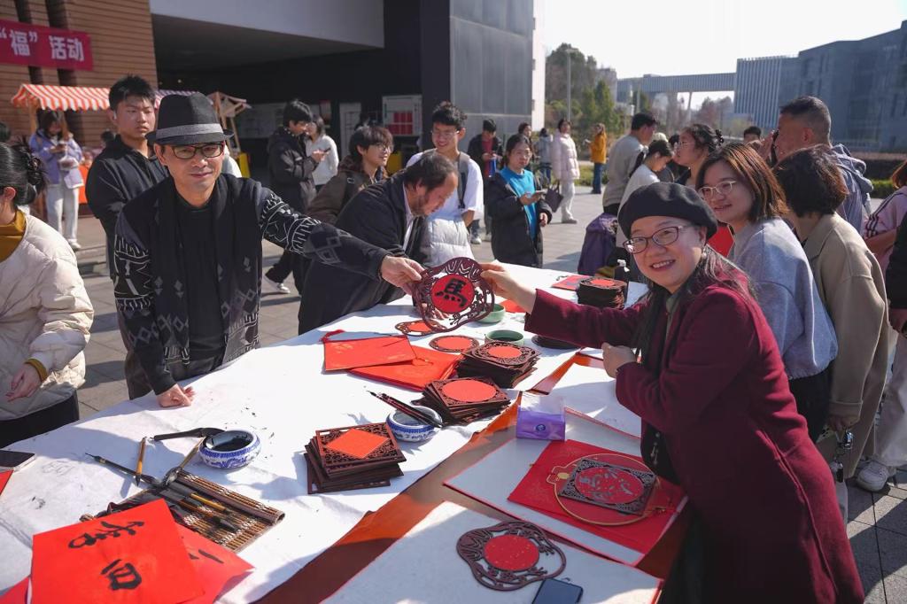 20261222,浙江科技大学安吉校区怡竹书院以“龙马裁福启新岁”为主题办元旦送福活动。师生齐聚银杏广场,借书法创作、福字互动传递新年祝福,让传统年俗与校园活力相融。