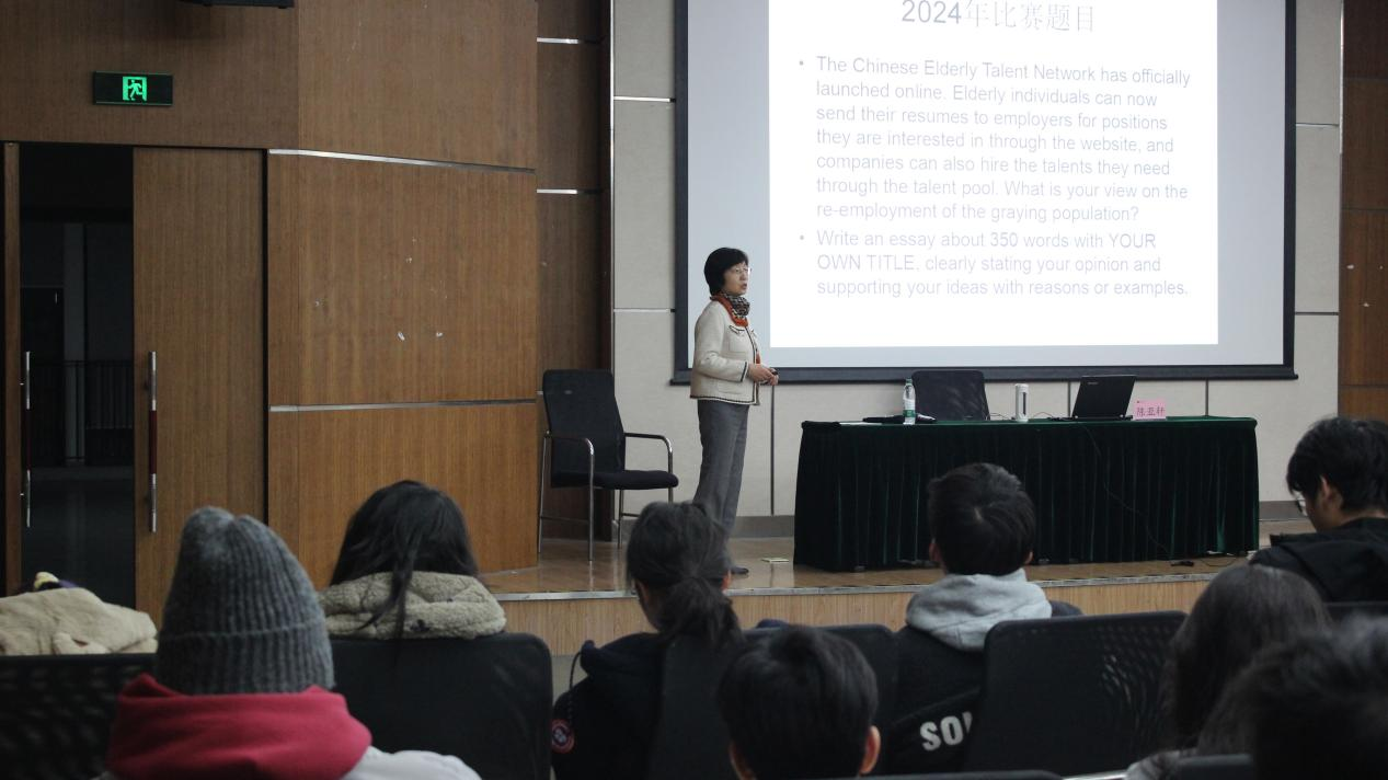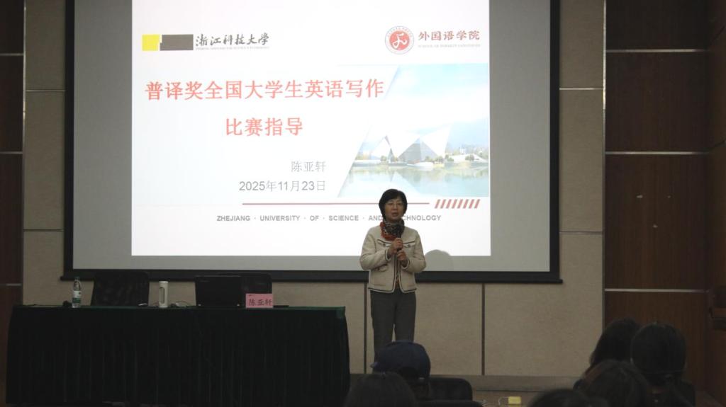 11月23日晚,安吉校区在中德B四楼报告厅举办了学思讲坛第二十一讲:2025年普译奖全国大学生英语写作大赛动员报告,人文与外国语学院陈亚轩教授主讲,校区170余名师生参加。