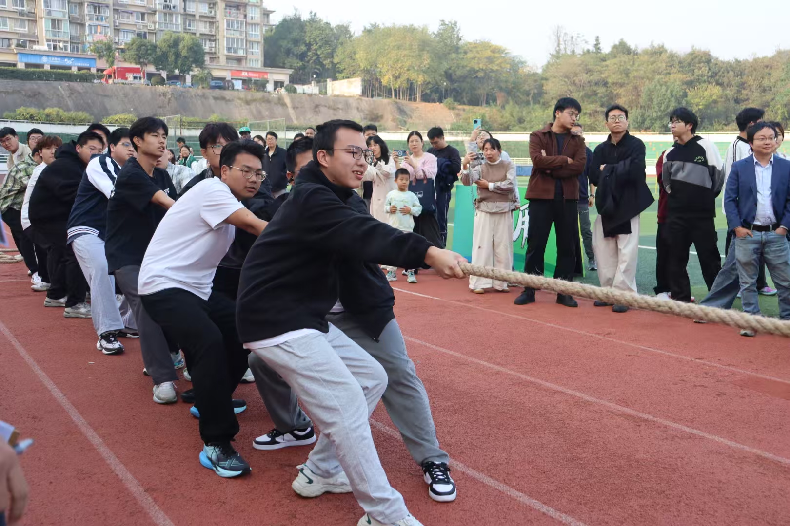 比赛现场气氛热烈,助威声、呐喊声此起彼伏。决赛对阵环节,机械253班队员们紧握绳索、重心下沉,眼神坚定且充满斗志。面对强劲对手的顽强抵抗,他们始终保持整齐的发力节奏,“一二、加油!”的口号声铿锵有力,每一次僵持中的咬牙坚持、每一轮发力时的同心协力,都展现着班级凝聚力与青春拼搏力。从小组赛到总决赛,22名队员拧成“一股绳”,以扎实的配合与不服输的韧劲突破重围,最终在关键对决中凭借持续爆发的力量锁定胜局,赢得全场热烈掌声。